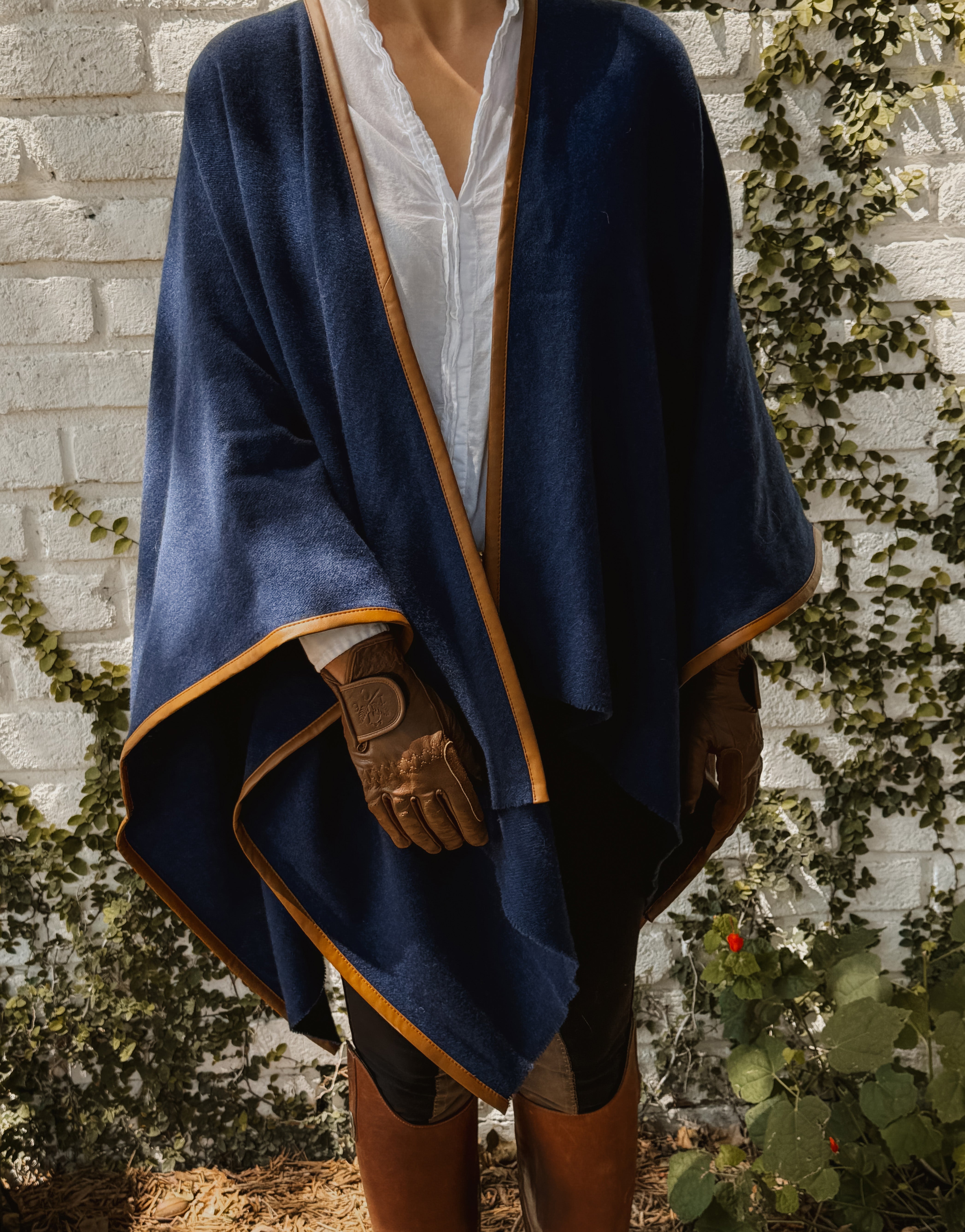 Cut in the style of an open-front poncho, the Cavallina Wrap — “little horse” in Italian — is crafted in Italy from navy merino wool and finished with cognac leatherette trim.