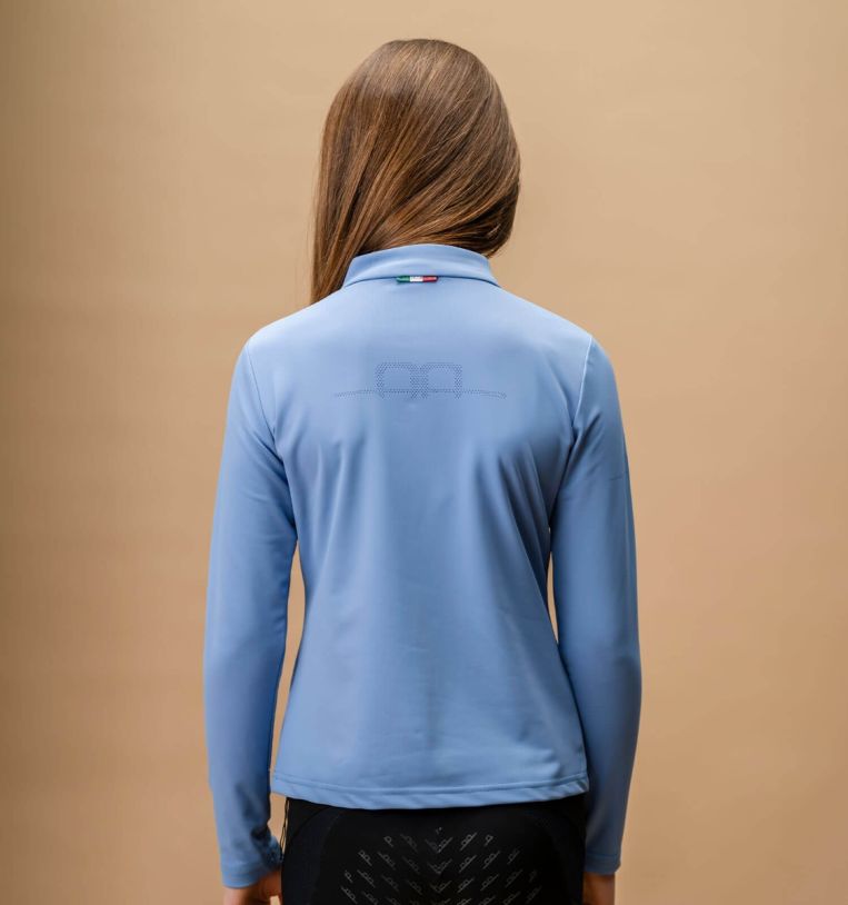 The Alessandro Albanese® Sofia Sunshirt is an ultra breathable and multi-functional long sleeve top that keeps up with young riders while riding or around the yard. Mesh underarm and perforated side panels ensure maximum airflow while UPF 50+ treatment protects from harmful UV rays. Laser-cut detail on back adds further ventilation. Cut from a luxuriously soft, 4-way stretch recycled nylon blend. Classic 1/4 zip with extended stand-up collar.