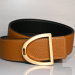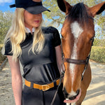 Two looks, one timeless belt. This reversible pebbled leather belt features rich chestnut on one side and classic black on the other, offering effortless versatility. Paired with a brushed gold stirrup buckle, it adds a refined equestrian touch to breeches, denim, and dresses alike. A timeless luxe essential for the rider who loves options.