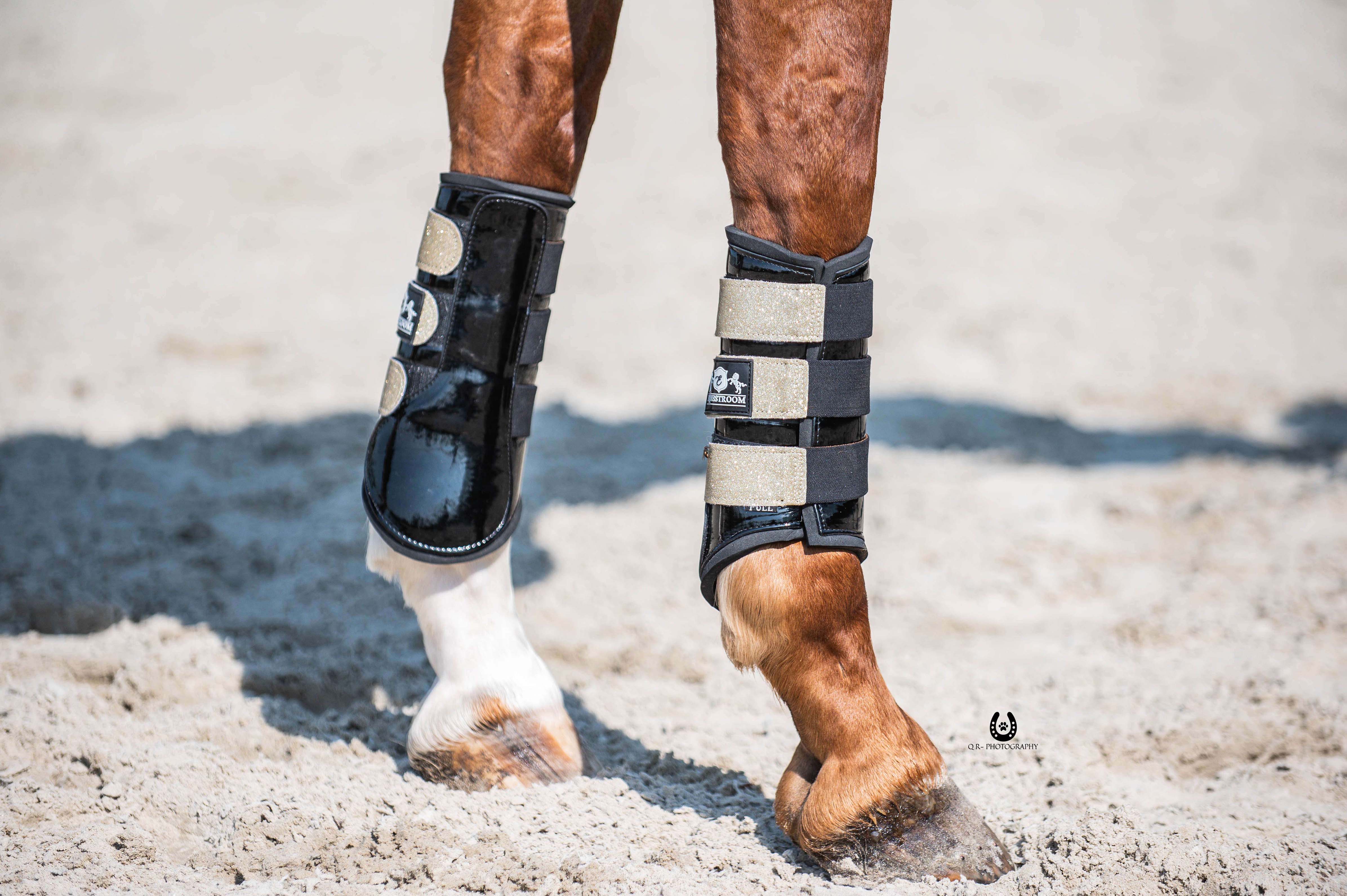 Ultimate shine and elegance - this saddle pad set will definitely captivate everyone's attention! Champagne sparkly saddle pad with soft and ultra-thick padding, black protection boots with shiny matching stripes, fly hat, chic browband, and matching fly hat with glitter!