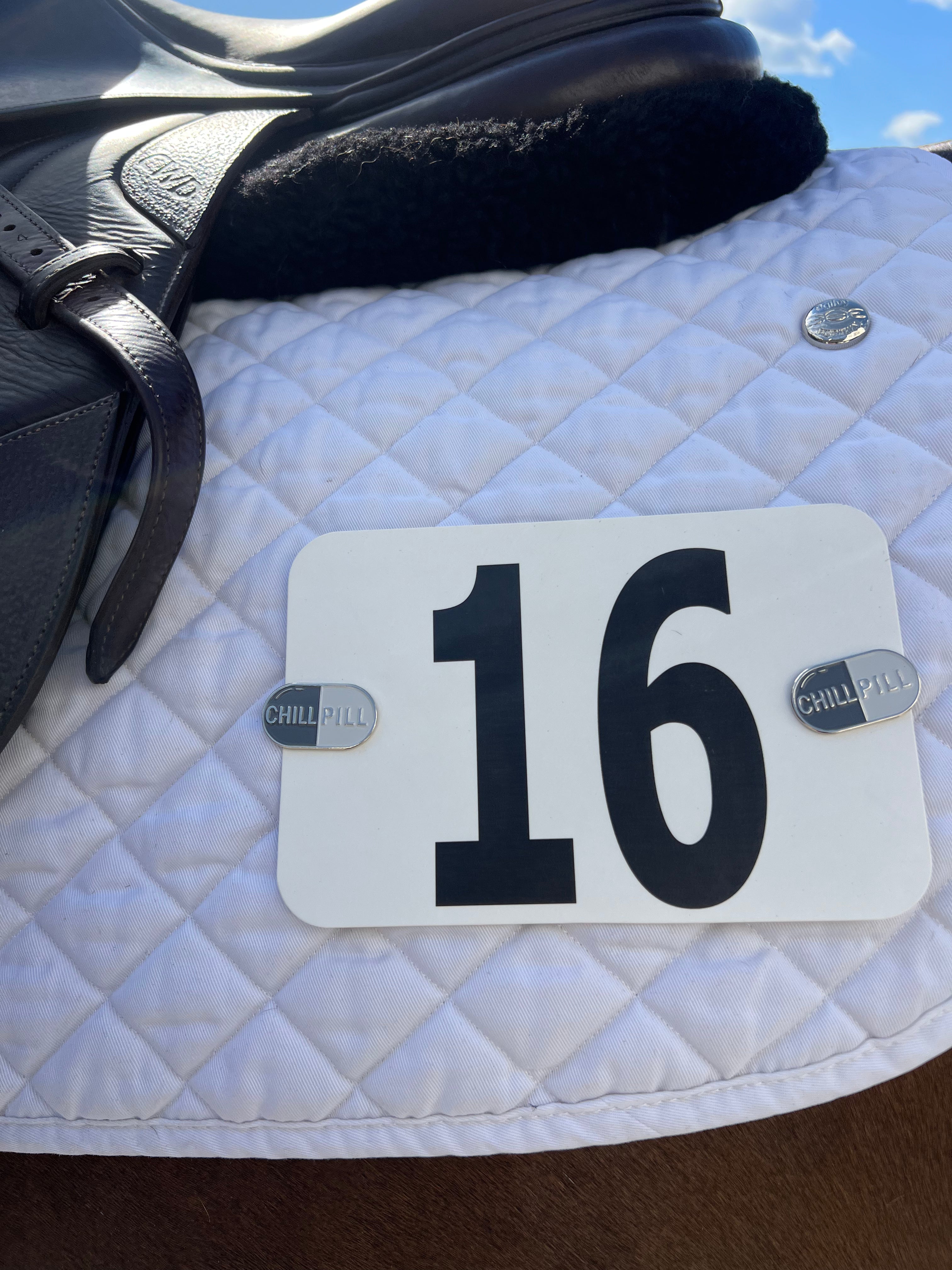 The most polished way to secure your show number to a saddle pad or your back.  We also love to wear them on bonnets, baseball hats, and our jacket lapels!