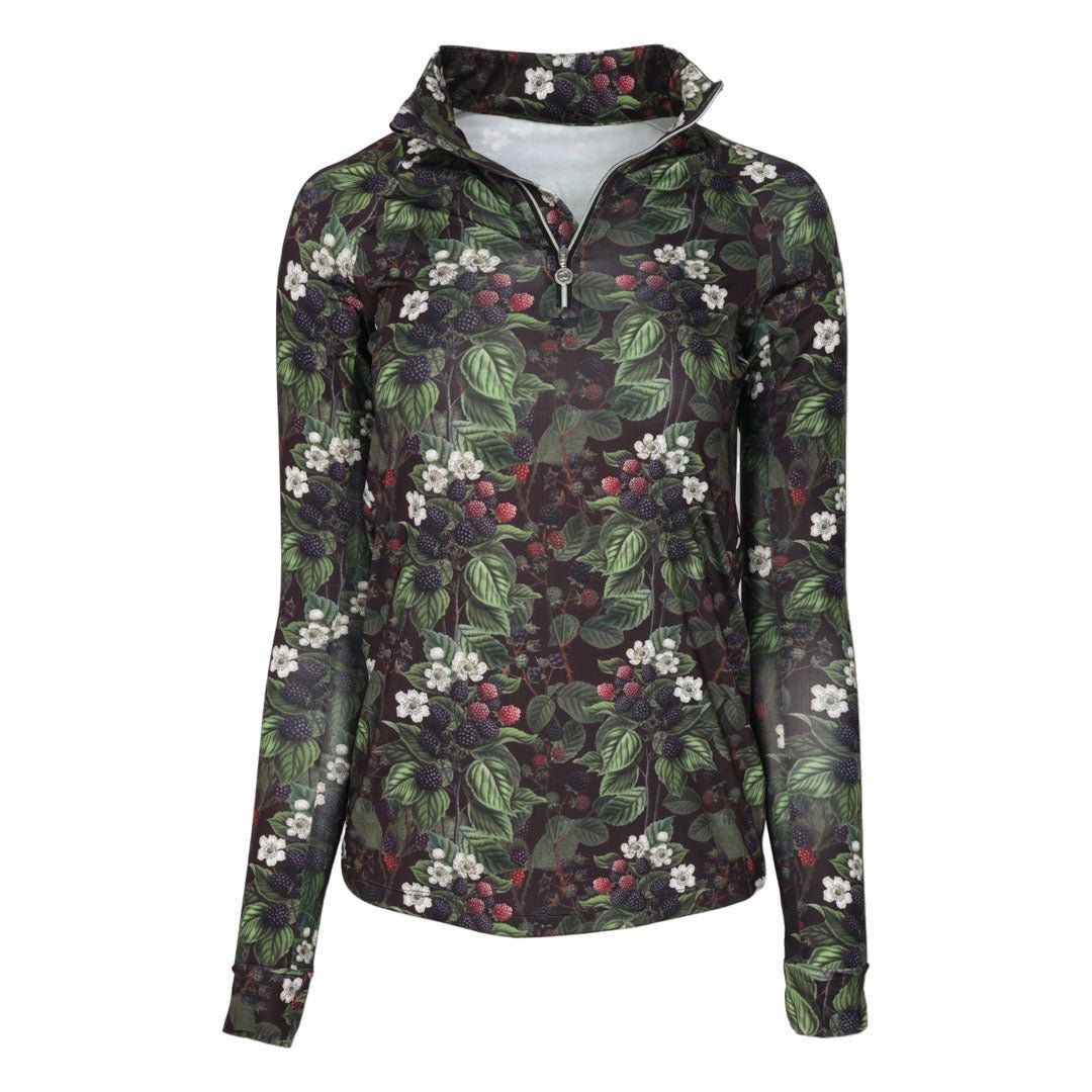 The elegant Blackberry Daze Riding Shirt is a premium 1/4 Zip top featuring a moody and captivating design that's a perfect nod to summer’s last lazy days. This rich pattern showcases vintage blackberry vines weaving to create a unique and sophisticated look, making it a standout piece for any equestrian. Crafted from a perfectly light, feather-weight fabric with an incredible 'ice feel', this equestrian sun shirt offers superior protection in warm temperatures or serves as a comfortable layering piece when the weather cools. Designed true to size and elegantly fitted, its longer length ensures it stays neatly tucked into your breeches for a polished look in the saddle and beyond.