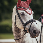 Luxurious crocheted ear bonnet in a stylish dark amber red color. Decorated with a light pink satin patch on the front, beautiful amber red piping and an Equestrian Stockholm badge in silver. The ear net provides both insect protection and noise reduction. It has elastic cloth on the ears for extra comfort.