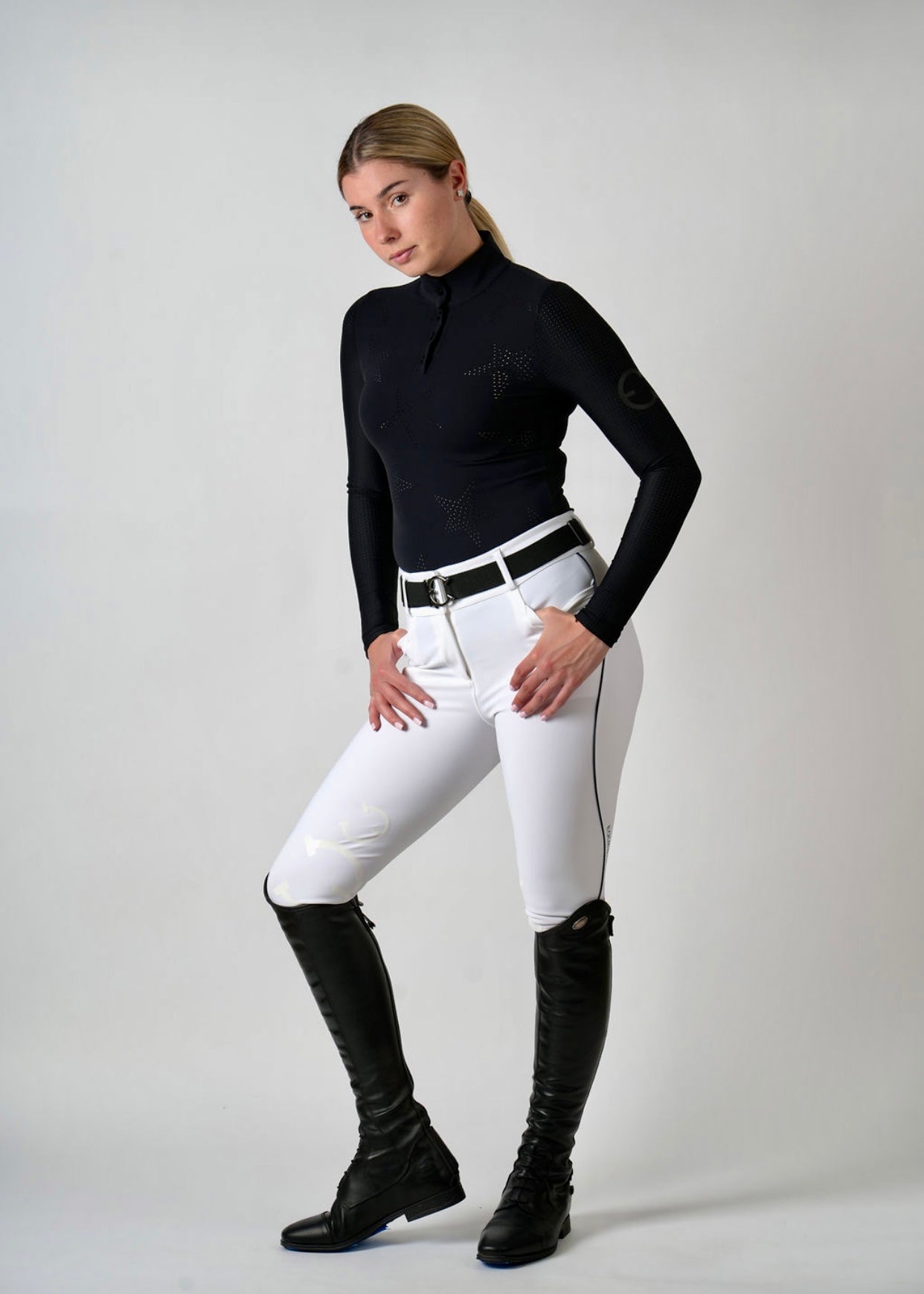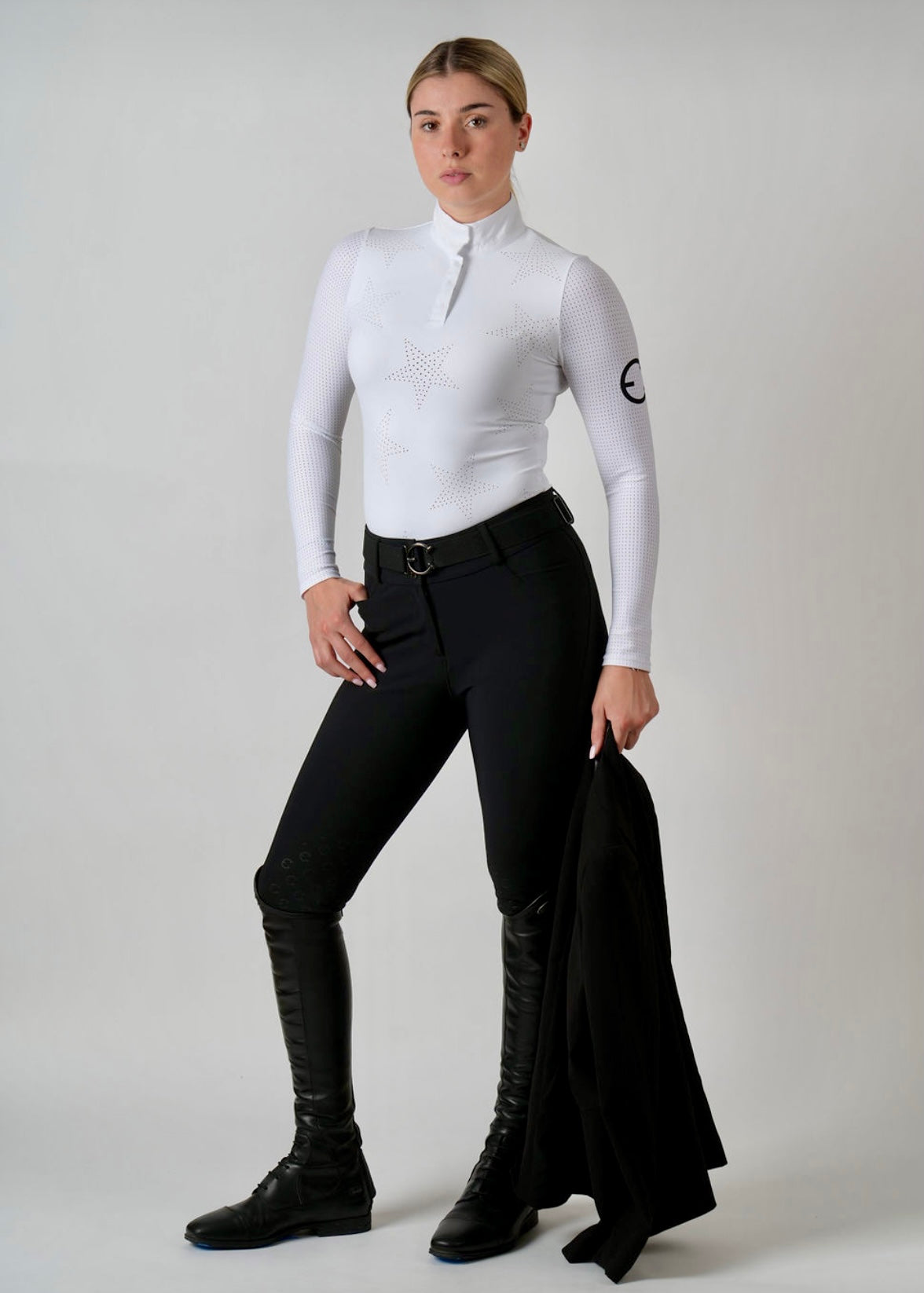 Stars are associated with achievement, excellence, and success. That’s why we created this simple yet flattering STAR show shirt for equestrians that want to look and feel special. Laser cut stars beautifully flow on the body with perforated long sleeves for comfort and perfect fit. Our STAR shirt will definitely be your favorite and will make you feel like a shining star!