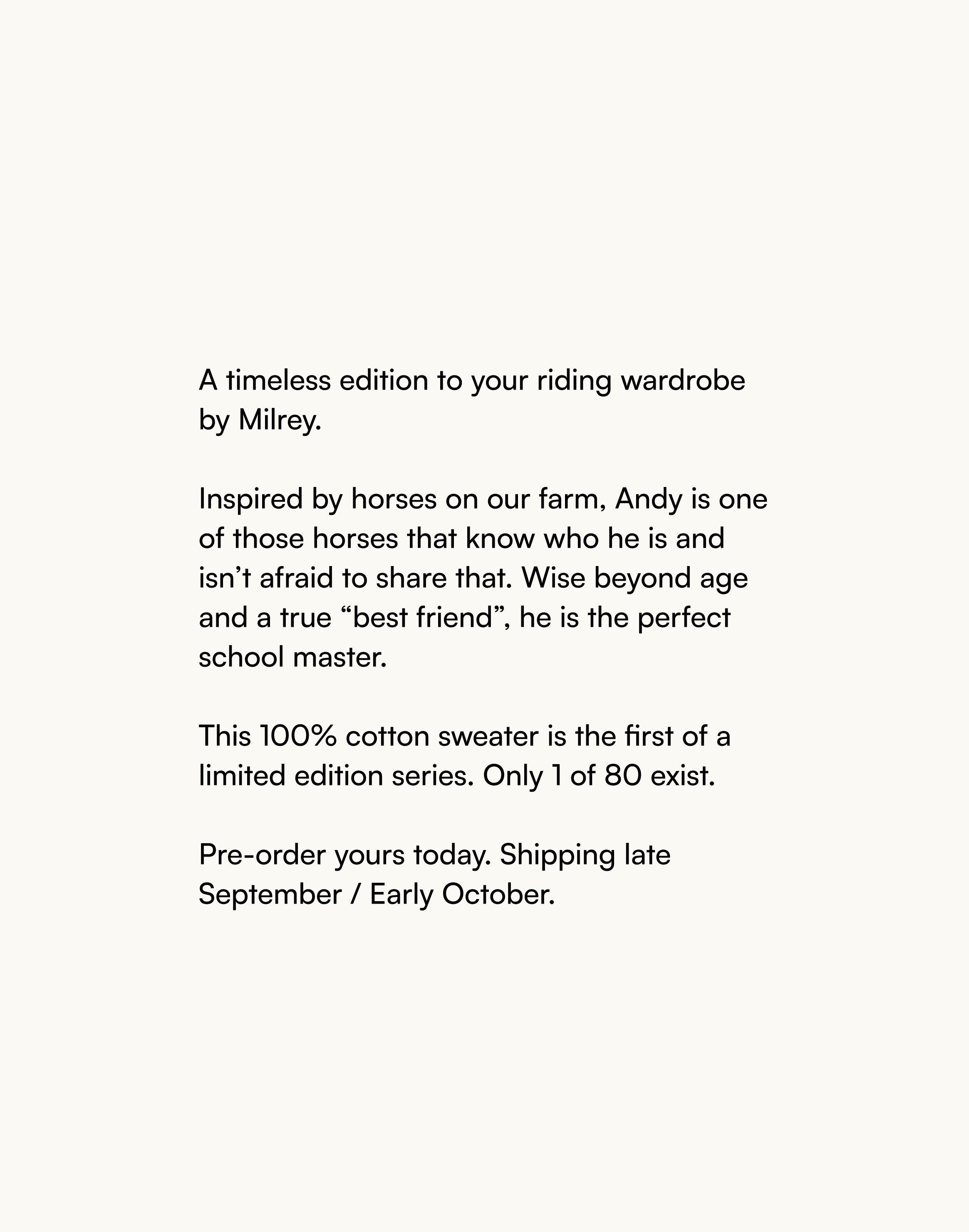 Limited edition, meet Andy, one of the icons in our horse head sweater collection - in a cream caramel knit colour. A refined essential, made for layering. The Milrey Horse Head Sweater is knitted from pure 100% cotton for comfort that lasts beyond the season. Subtle branding, timeless fit, and everyday versatility.