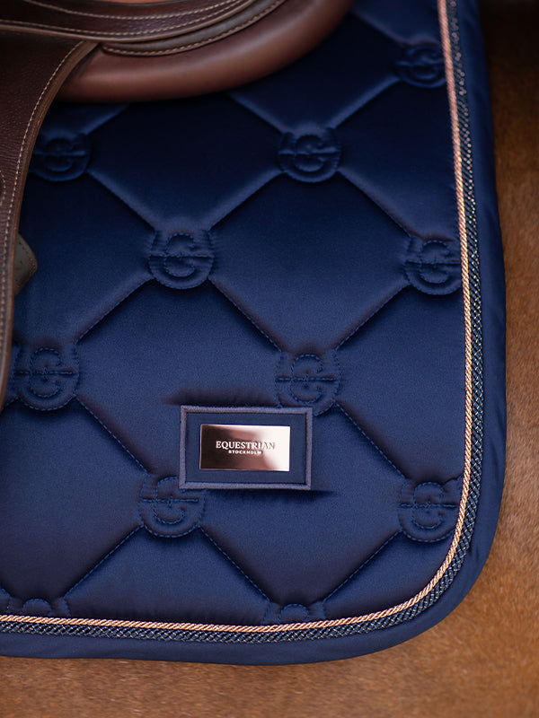 Elegant saddle pad in blue with rose gold details. Decorated with the Equestrian Stockholm badge in rose gold. The material is treated with High IQ cool comfort which gives the saddle pad quick dry and moisture wicking abilities. This helps your horse stay dry and fresh longer. Style with other pieces from our Lagoon Blush collection for a head-to-toe stylish look.