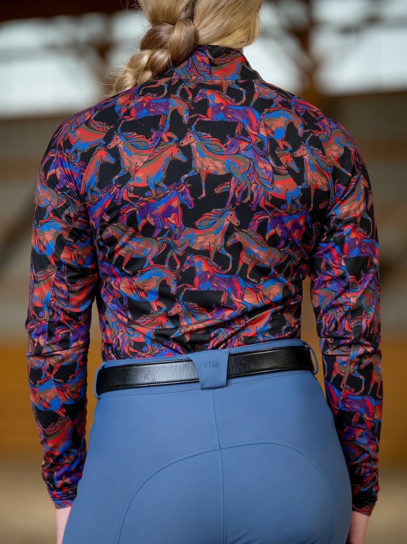 Available in classic black and our exclusive Wild Horses jewel-tone print, Juniper offers equal parts function and style. Whether layered under your favorite vest or paired with breeches for all-day rides, it’s built to keep you warm without restricting your freedom of movement.