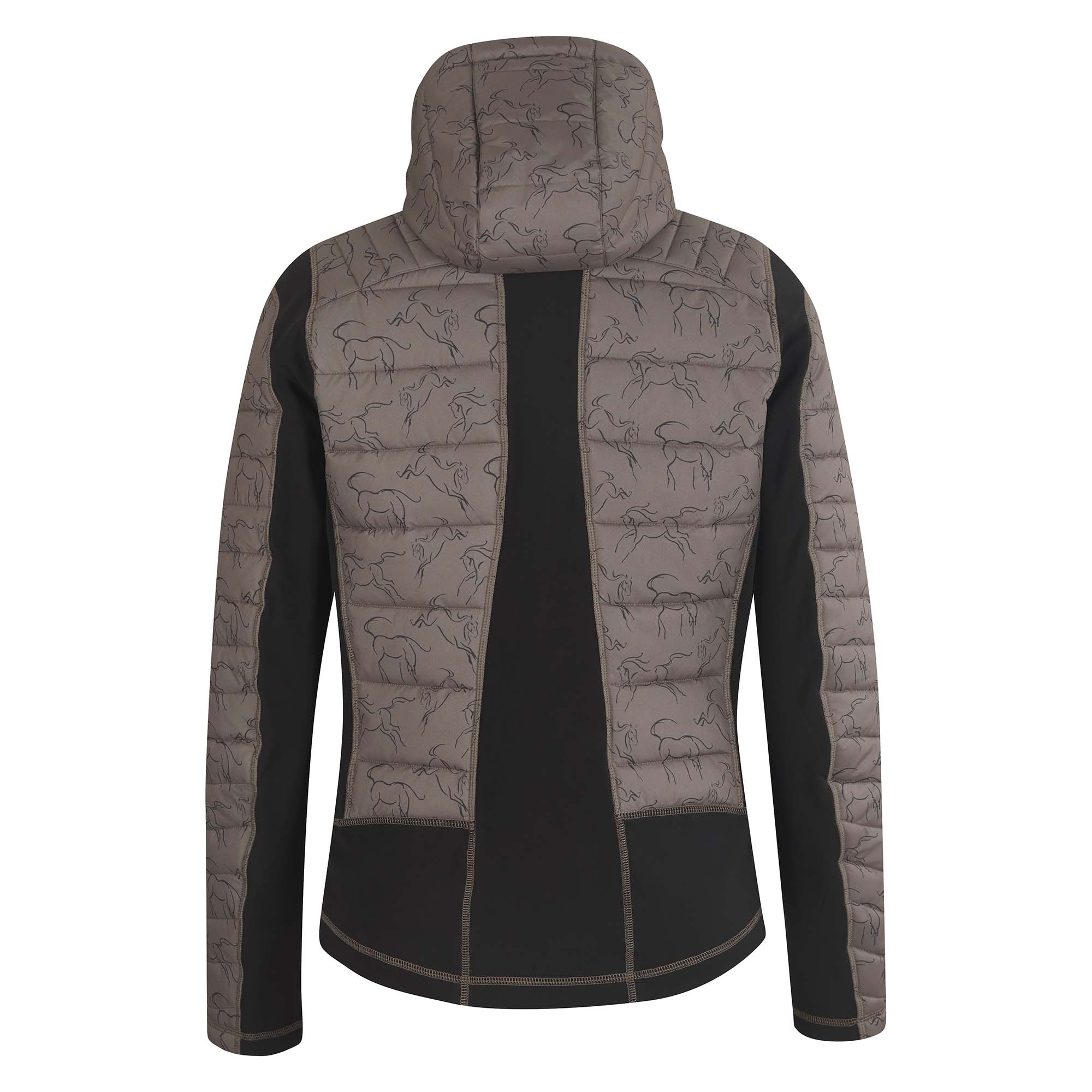 This versatile riding jacket pairs two warming favorites, 140 gram quilted poly-loft and stretch fleece, for cozy and functional winter performance. Ergonomically shaped stretch fleece panels are key to unrestricted movement and a flattering fit. Wind and weather resistant with fully quilted hood to pull on after the helmet comes off. Generous interior pockets and two exterior zip pockets.
