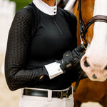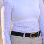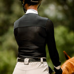 The design is a study in refined innovation: a solid upper panel offers the polished appearance of a traditional show shirt under your coat, while the lower half transitions into a laser-cut, breathable fabric that extends through the entire back—delivering exceptional airflow without compromising sophistication.