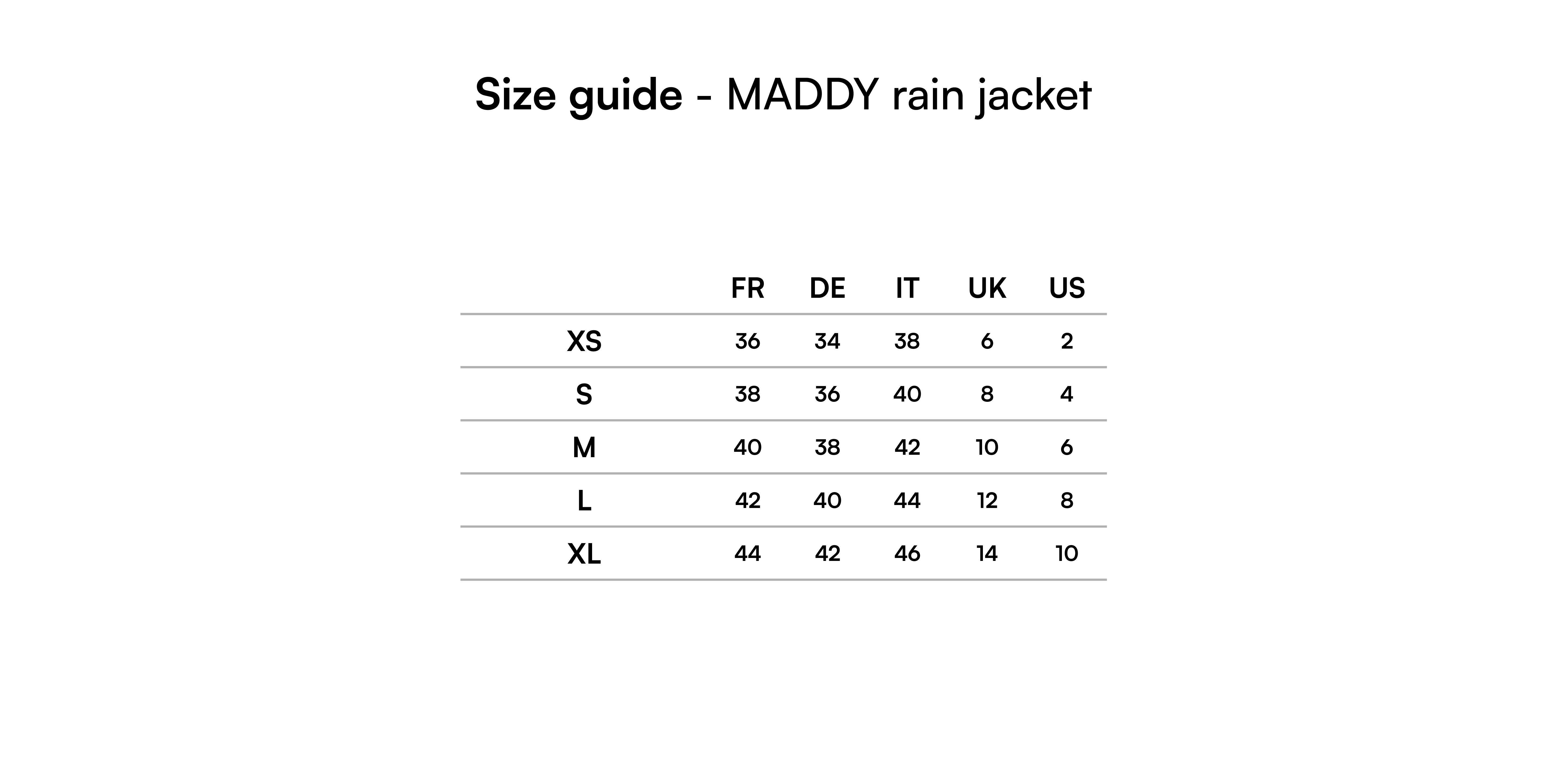 The MADDY rain jacket can be machine washed at 30°C / 86°F maximum temperature, do not tumble dry, no ironing.