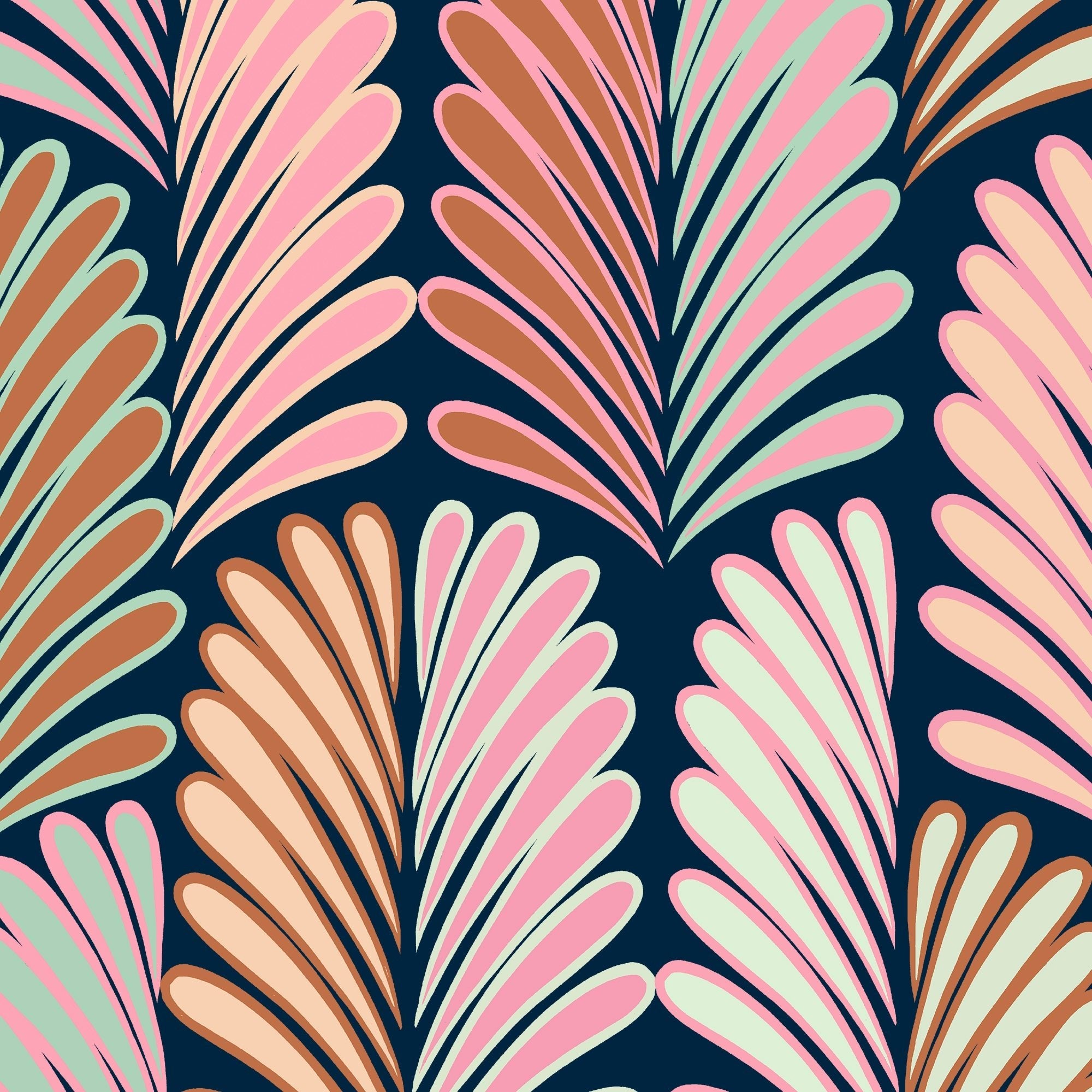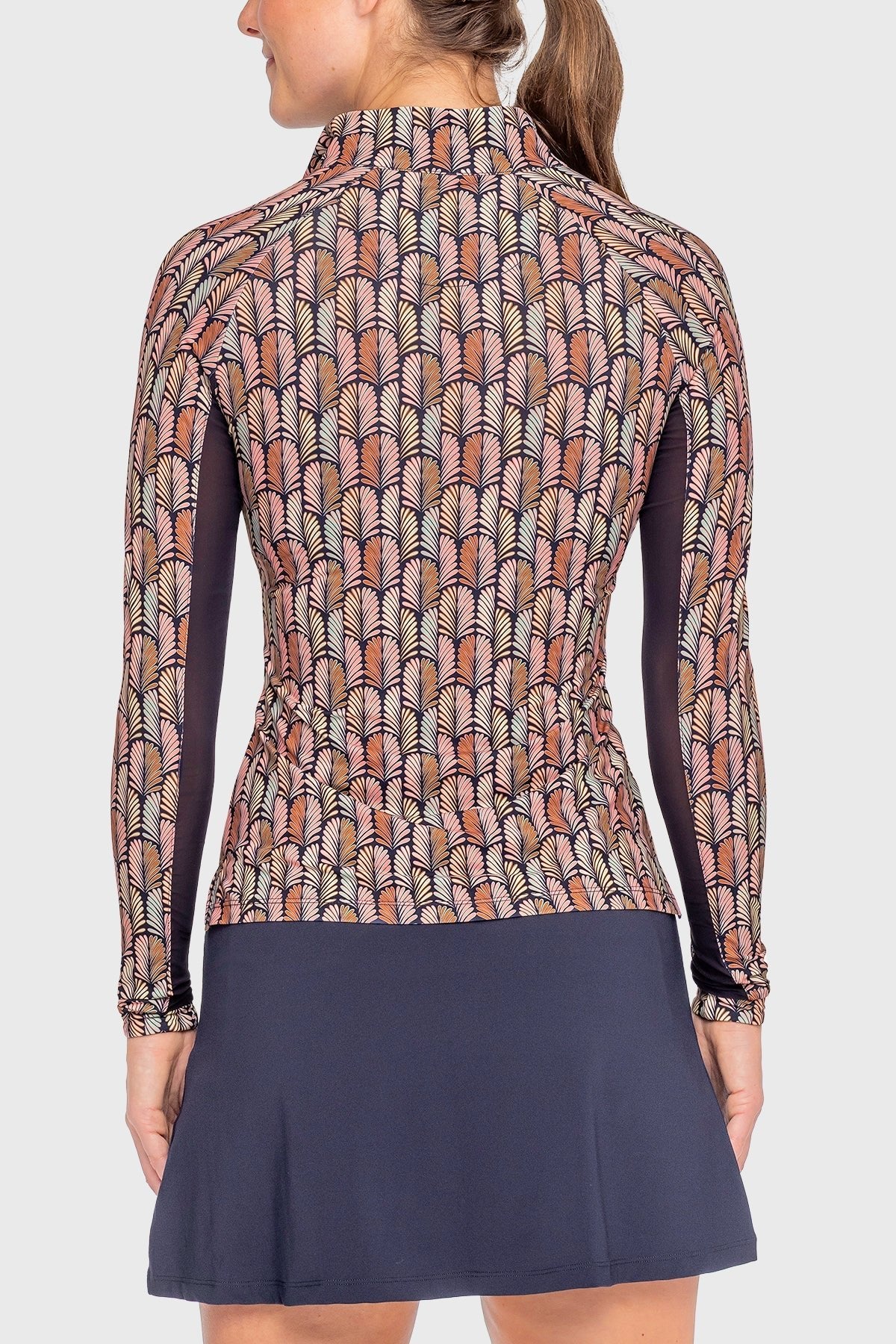 A contemporary twist on an art deco classic.  Our plumes deco print features soft pink, mint and sienna with a classic rich navy ground. This long sleeve must-have is meant to be part of your essentials.  Long sleeves, breathable power mesh, 1/4 zip, UPF 30 and soft 4-way stretch fabric in a contemporary fit.