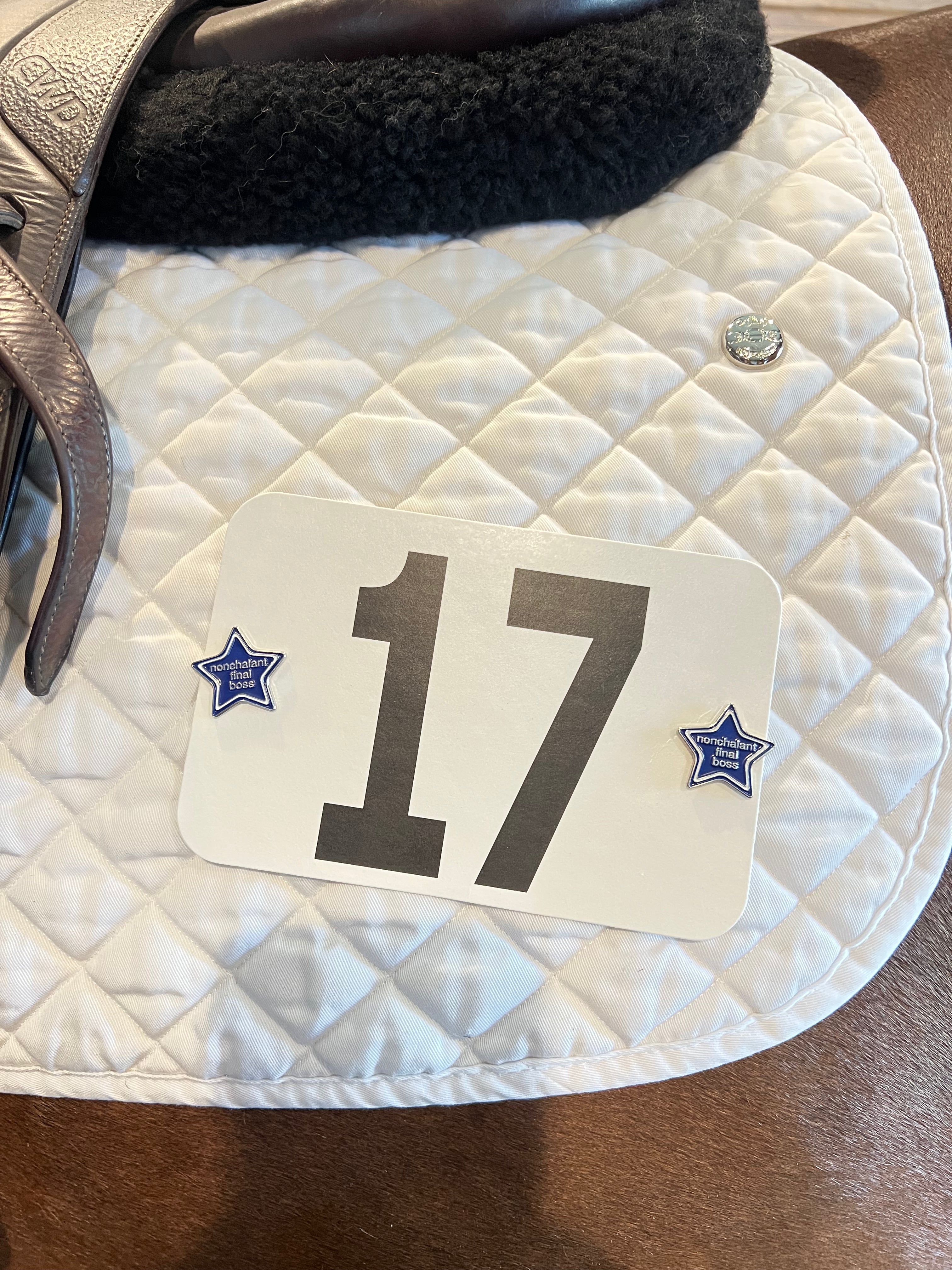 The most polished way to secure your show number to a saddle pad or your back.  We also love to wear them on bonnets, baseball hats, and our jacket lapels!