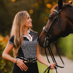 The Raymeister Show Shirt is a literal show-stopper complete with a US Equestrian approved Integrated Collar for the dressage show ring. Say goodbye to uncomfortable stock ties and just zip and go to give you a polished look in the ring. This shirt is also approved to wear when coats are waived and can be worn as an adorable clinic or schooling shirt. With a low profile zipper, white and black ruffle and roomy collar for breathability, this design is super flattering with a small mesh underarm.