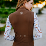 THE FIRST OF ITS KIND! The Sara Vest (available in Black Beauty & Cocoa Brown)  is inspired by everyone's horse girl bff - and this vest will be your new bff too! The Sara Vest is a lightweight vest that comfortably compresses, flatters your figure, smoothes areas we may be self conscious about and minimizes chest bounce in the saddle. It features metallic gold NOVELLA embroidery - on the collar, upper back and middle back featuring an adorable snaffle. The Sara Vest is a stunning piece that you'll wear all-year long.
