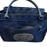 • Nylon tote with leather emboss and accents