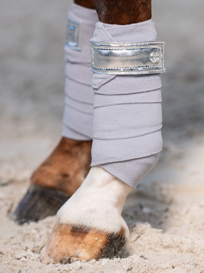 Crafted with meticulous attention to detail, these polos feature velcro fastening straps for easy application and removal, ensuring a secure fit during every ride. What sets them apart is the incorporation of decorative details from the matching collection, including the same main fabric and sequin trim as the saddle pad, creating a cohesive and striking appearance.