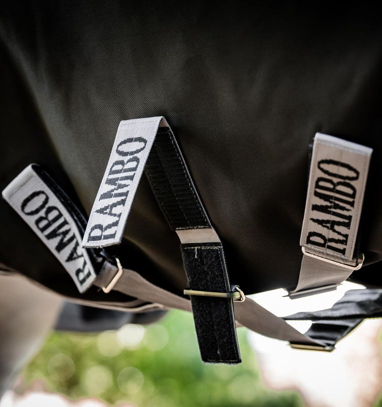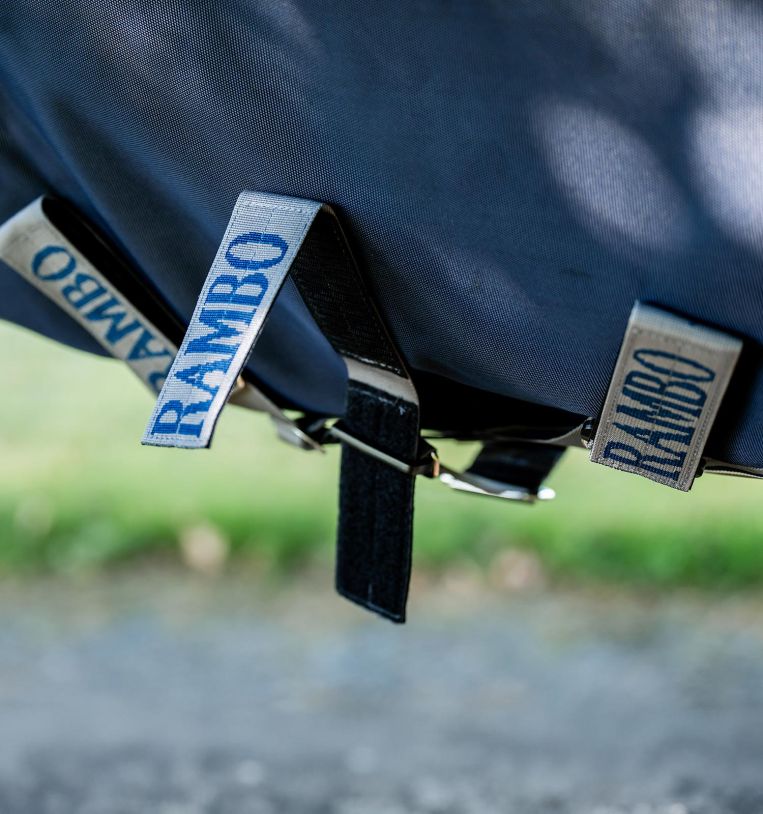 Additional details include reflective strips for increased visibility, a waterproof tail flap for added protection, a wipe-clean tail cord, three crossed webbing surcingles with the Rambo® Safety Surcingle System for a secure fit, a Velcro sandwich hood attachment for optional hood compatibility, and leg strap compatibility for additional stability. The anti-static, anti-bacterial lining enhances both the comfort and hygiene of the blanket.