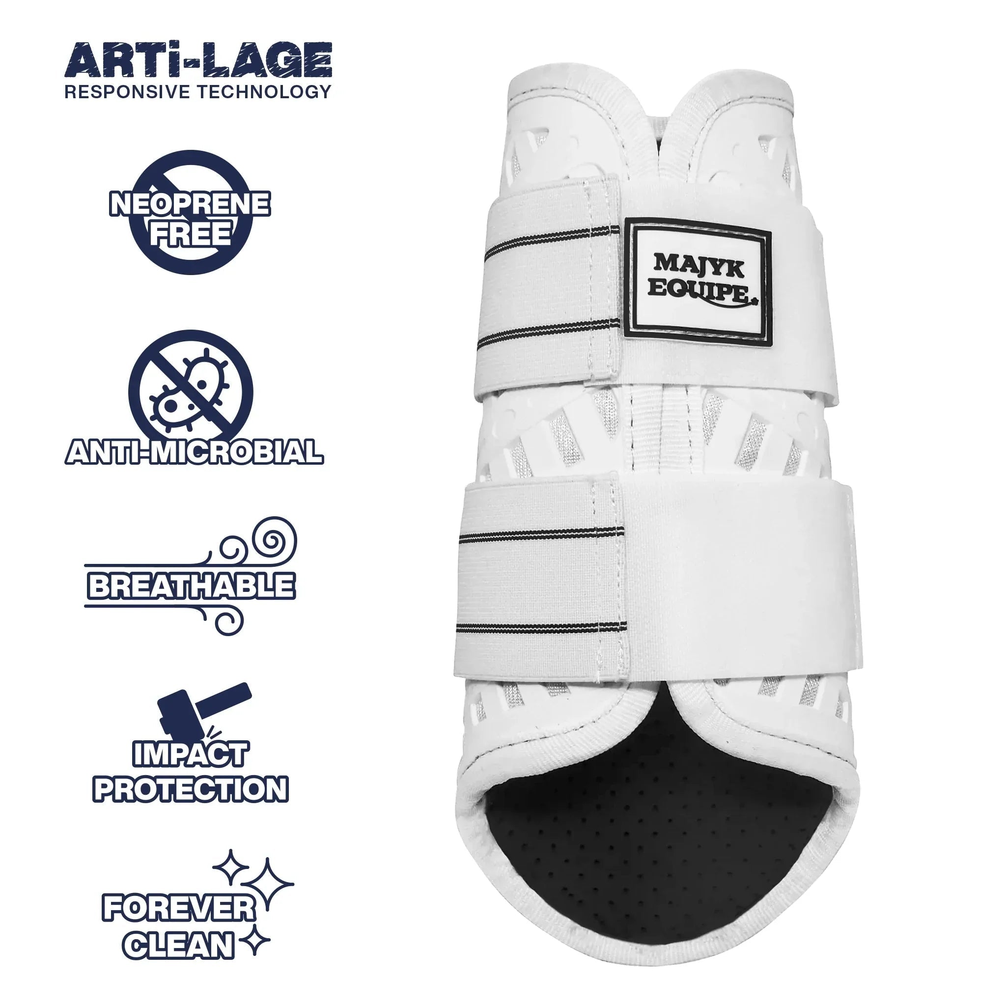 The Majyk Equipe Sport/Dressage boot features a tough, flexible outer mesh bonded to a breathable backing for durability and breathability. Its four-layer construction guards against dust, moisture, and heat build-up, making it perfect for longer training sessions. The inner side has a strike guard with ARTi-LAGE technology to protect against impact from rubbing and over-extension. The boot also has an eco-friendly Bio Foam interior with extra-large perforations for heat prevention and a super-soft finish for comfort and traction. Double-stitched finishes ensure durability, and it's ideal for trail riding as it doesn't pick up grass and burrs like traditional boots.