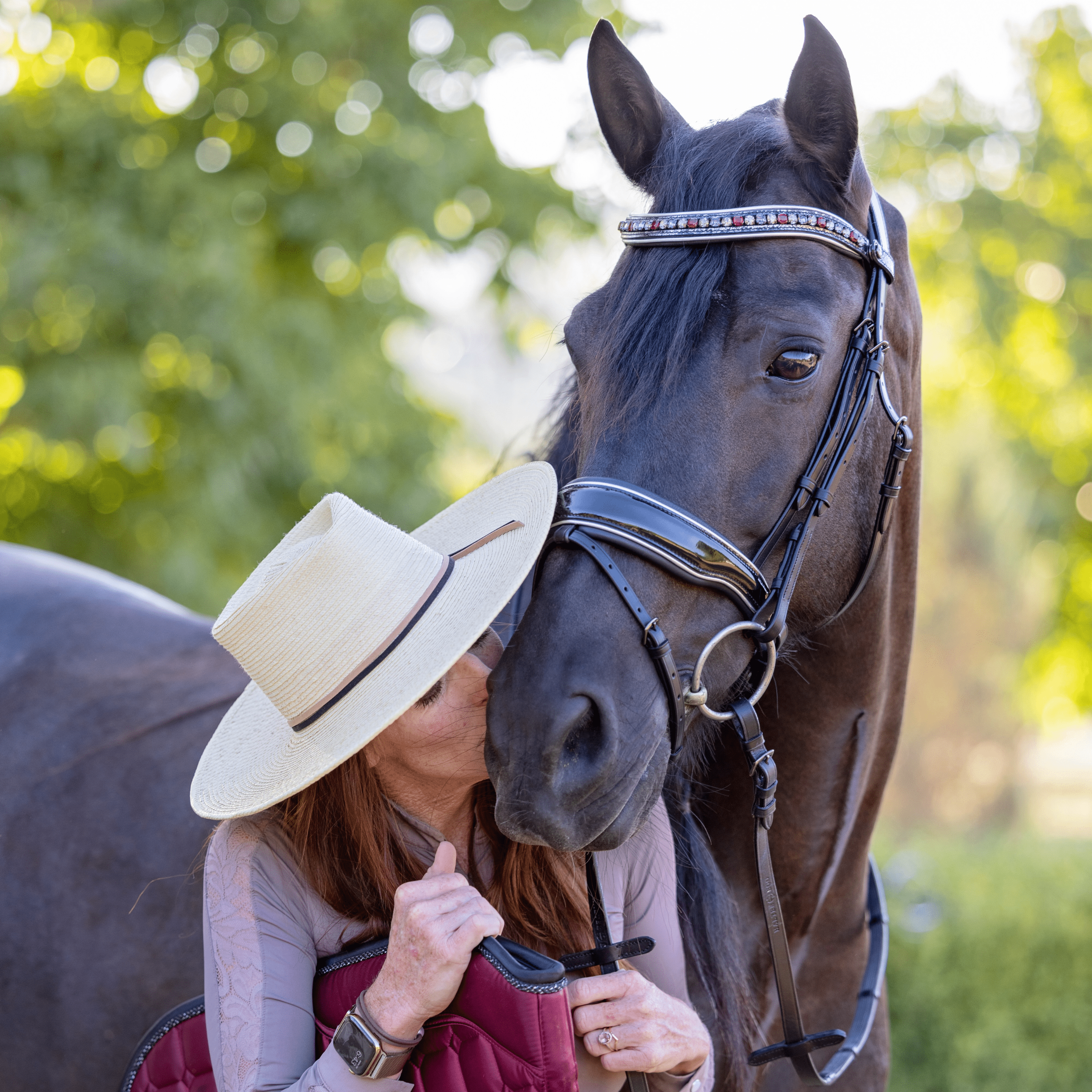 • Plush black leather padding anatomical noseband and crownpiece, ensuring the most comfortable fit