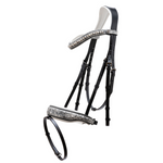 Inspired by the Marie Antoinette's jewelry collection, this snaffle bridle is a stunning combination of the highest quality vegetable tanned Italian leather, abstract floral pattern in shades of silver foil and blue grays, white padding, crank noseband & removable flash.