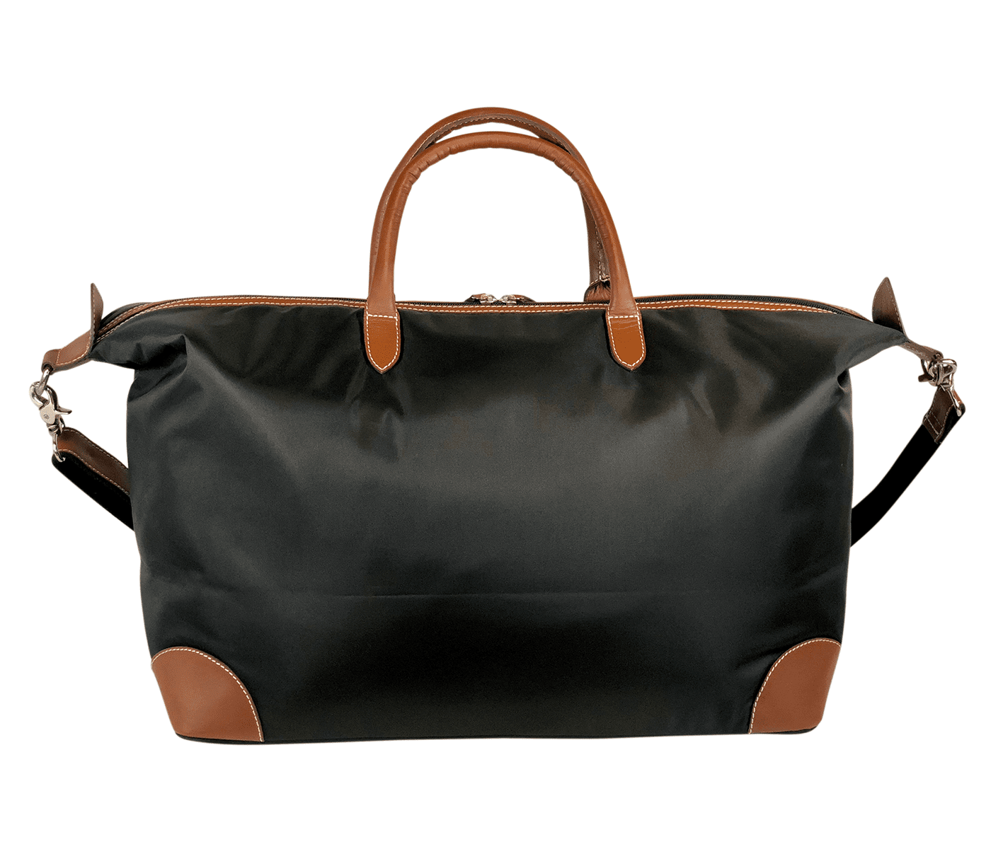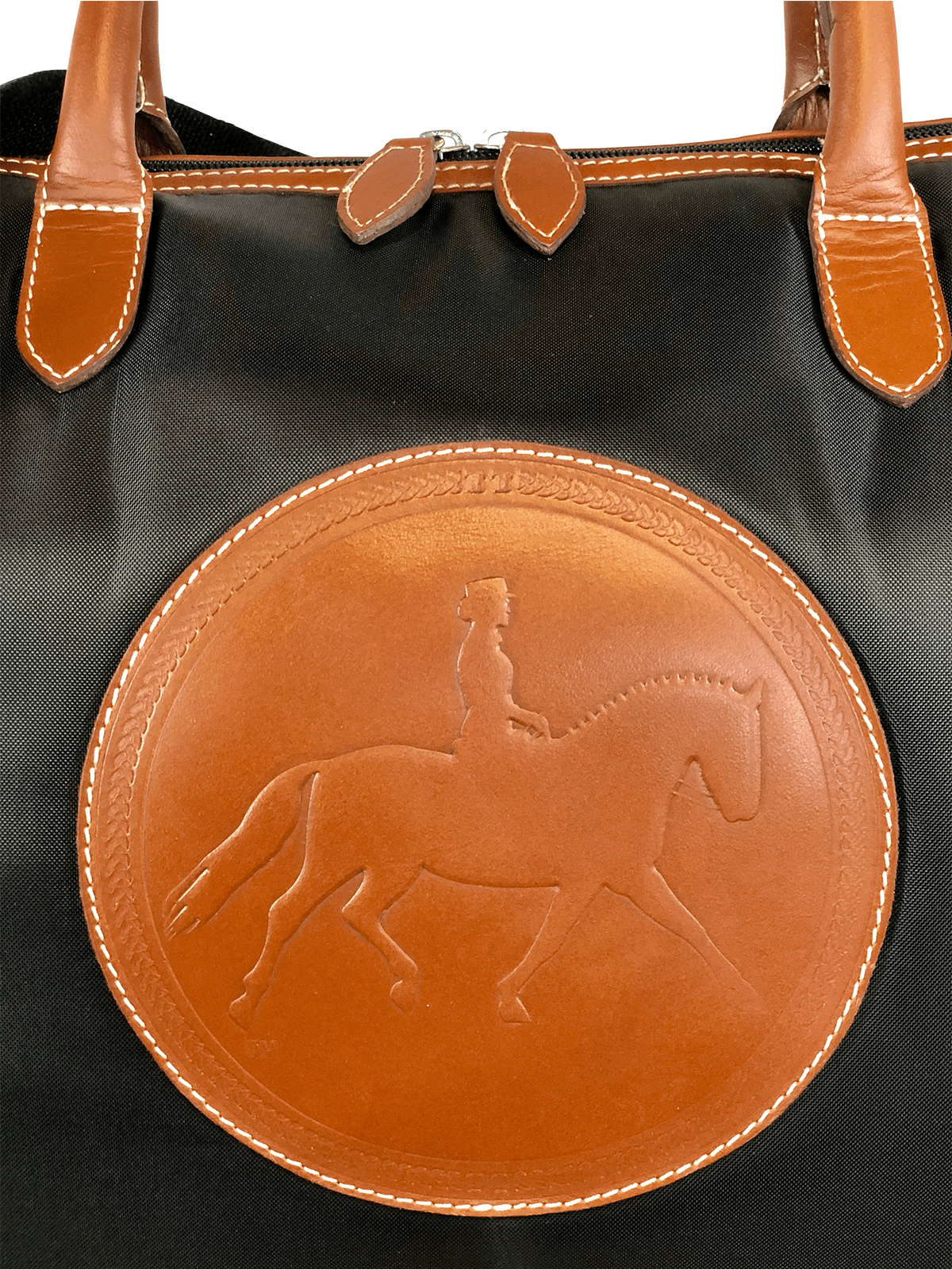 Our goal from the launch of the Tucker Tweed Equestrian brand 6 years ago was to ultimately travel in Equestrian style. We could not be happier to debut the newest piece of our collection. This generous overnight duffle bag is designed with padded heavy/duty 900d black nylon featuring full grain smooth leather accents in tones of chestnut or black. Comfort continues with supple rolled leather handles and an optional, adjustable padded shoulder strap.  Refined interior with private zip and open pocket. Finished with silver feet and hardware.