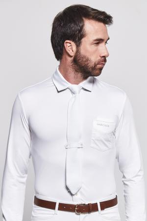 White polyester fabric tie features an easy close system with elastic for comfort and our Harcour logo.