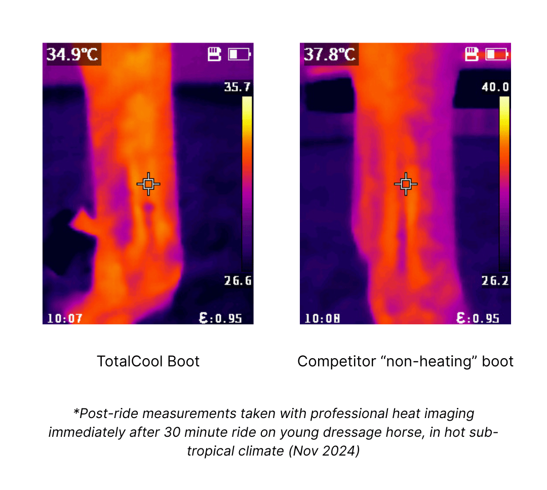 Our extensive testing has shown that these boots lead to a maximum of 1°C increase in soft tissue temperature during exercise, and in warm environment testing, results show that legs wearing TotalCool boots maintain a cooler temperature than a bare leg.