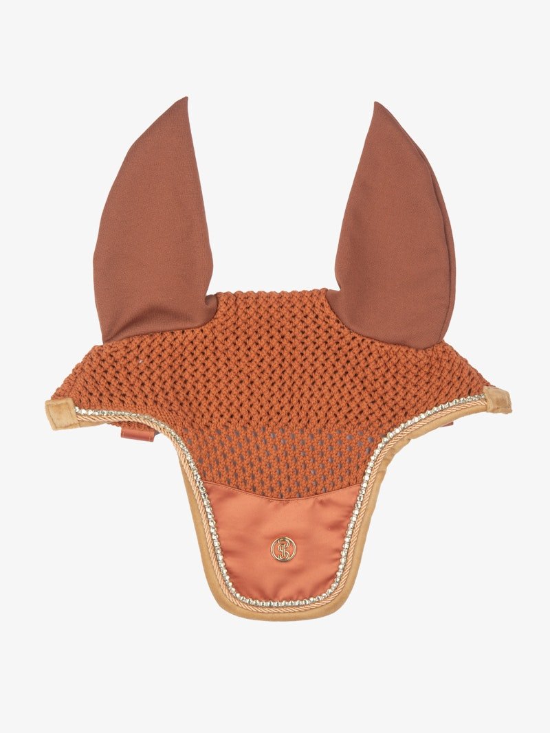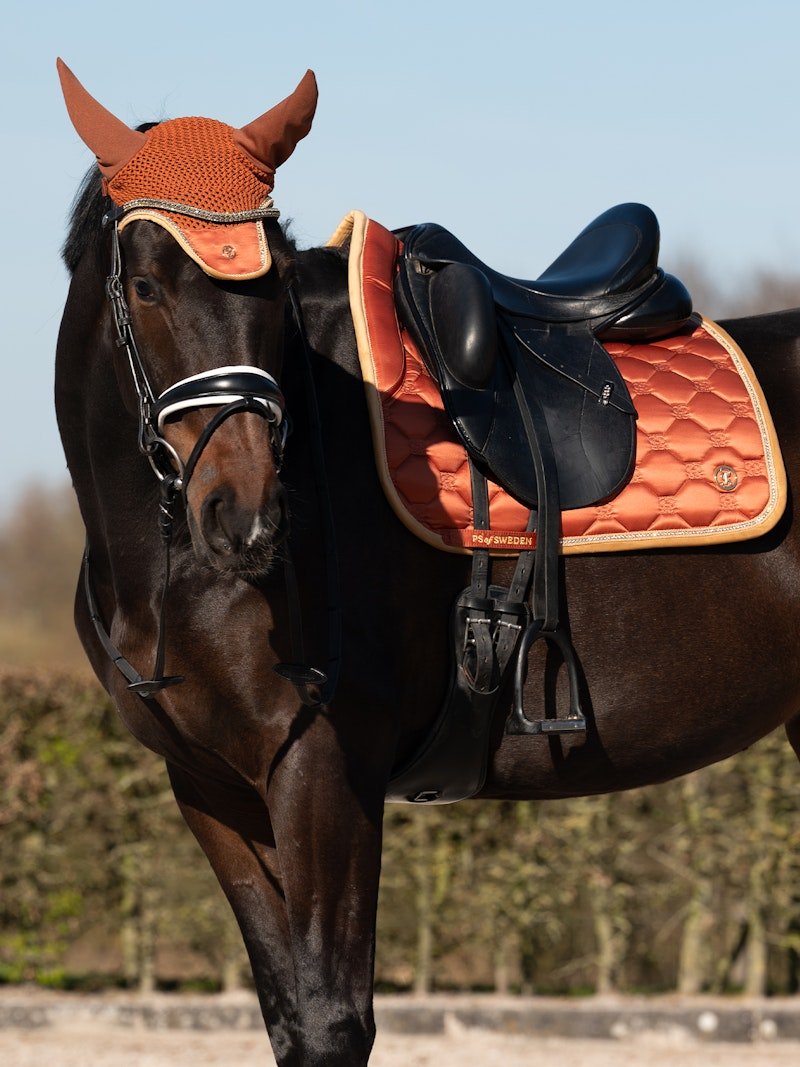 Hand-crocheted ear bonnet with a sleek design and PS monogram quilting, providing an excellent fit and thoughtful details. Decorative piping. The Vintage Monogram bonnet with PS monogram quilting is designed to match the Vintage Monogram saddle pad and Velvet Monogram bandages. Tailored and hand-crocheted for a perfect fit. • Elastic ears • Fly protection to keep insects away from the horse's ears • Hand-crocheted • Helps the horse focus during training and competitions by dampening distracting sounds • PS logo in metal