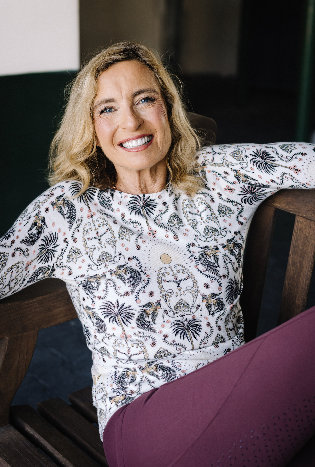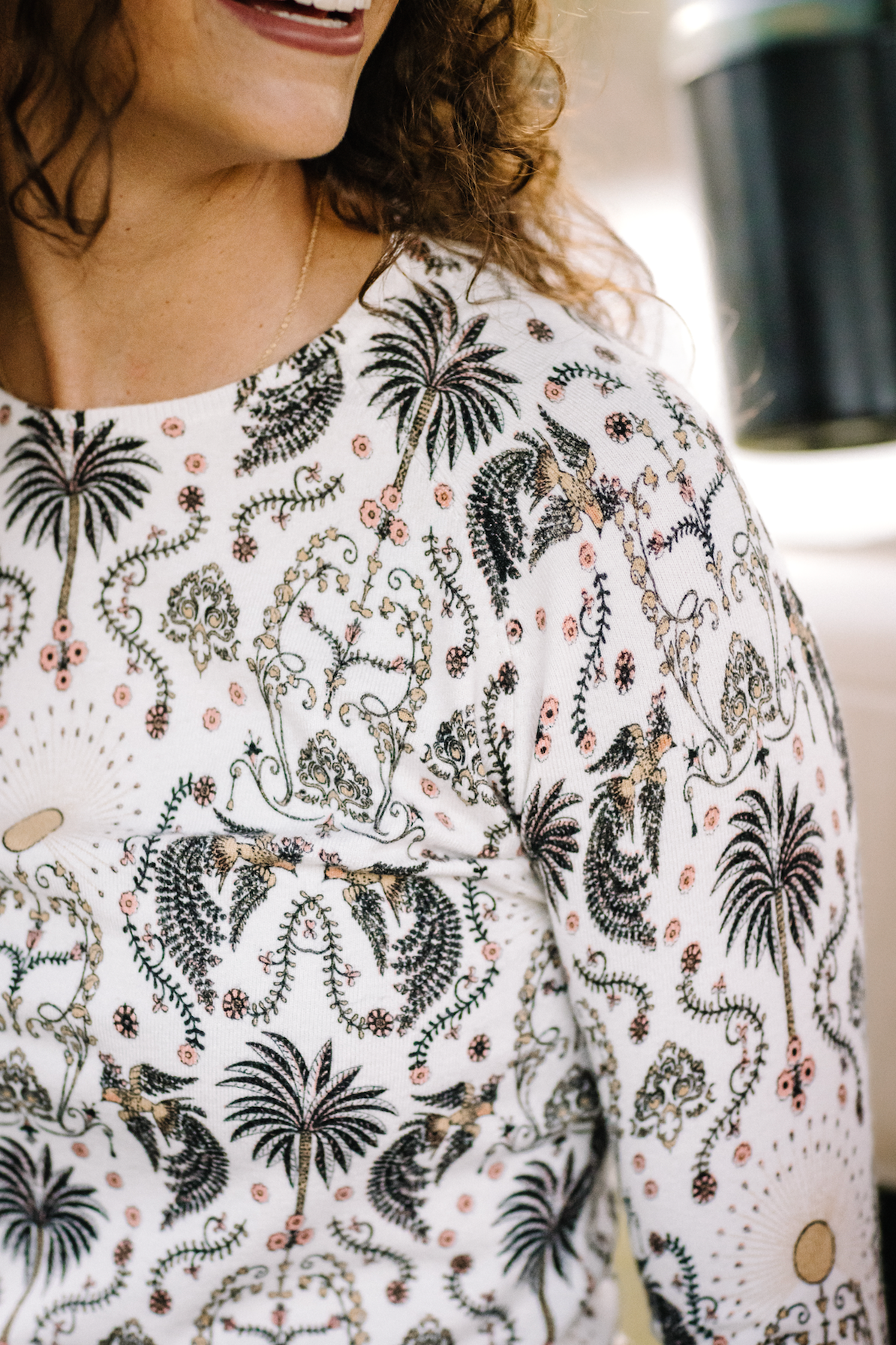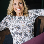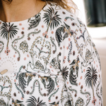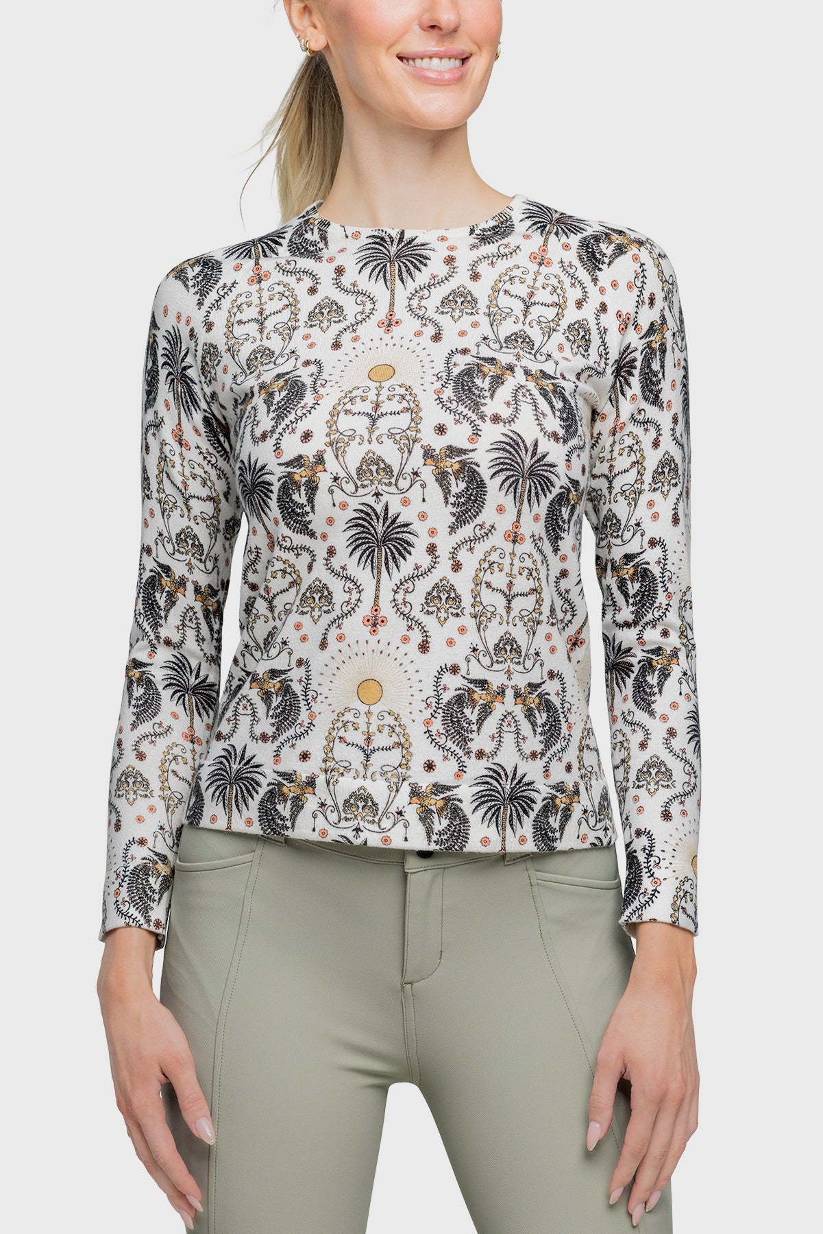 Our super soft Regal Palm Art Deco print sweater is divine. This cozy long sleeve crewneck will go with everything in your active wardrobe.   Cream ground, soft coral and desert sand.